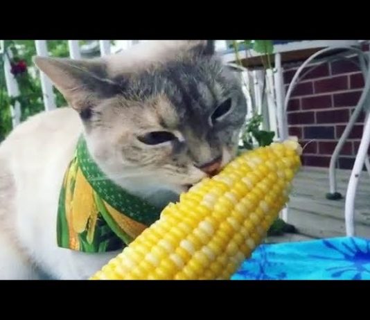一心不乱にトウモロコシを食べるネコちゃん
